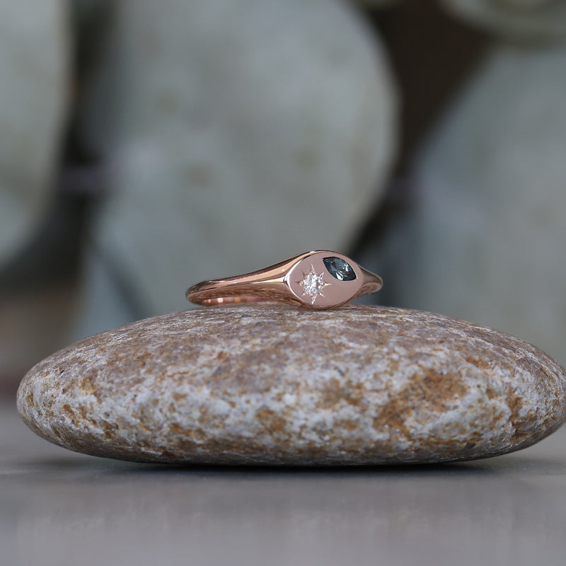One of a kind 9ct Rose Gold Star Set Sapphire & Diamond Signet Ring.
