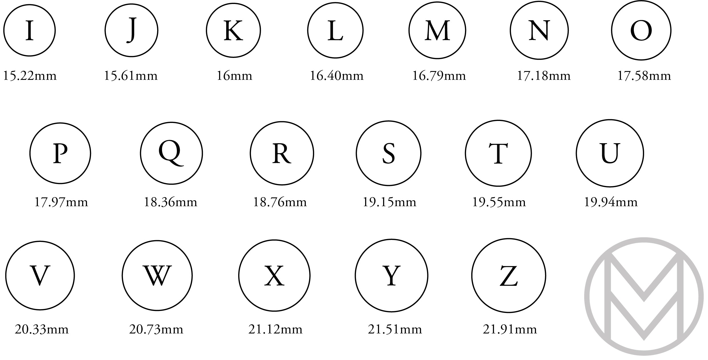 An easy way of knowing an accurate ring size is to measure an existing ring that fits the desired finger. Place the ring on top of a ruler, making sure you are measuring the centre of the band at its widest point. This will show you the inside diameter measurement. Use the chart below to convert it to your Australian Standard Ring Size.