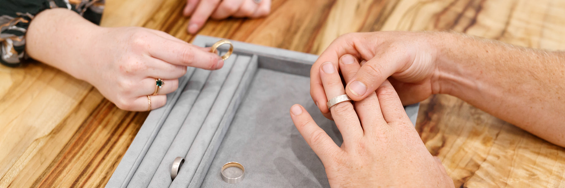 You are more than welcome to pop into the boutique at any time to have your finger sized. Alternatively, you can request one of our complimentary multisizers for accurate at home measurements. Just cover the postage and we'll have one sent to you within a couple of days.