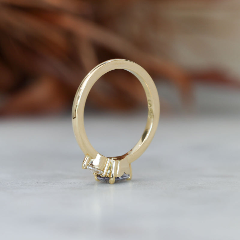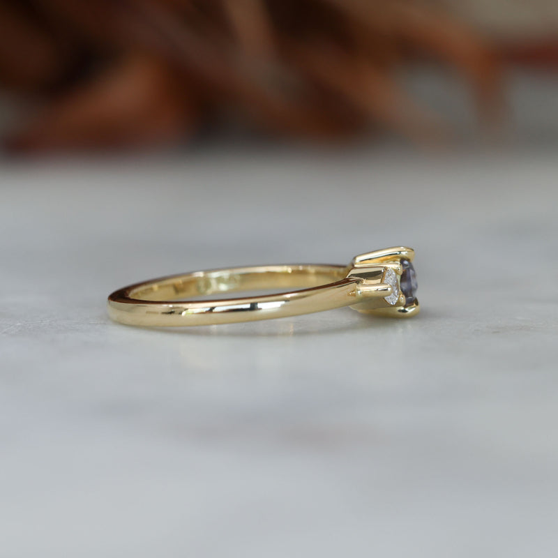 Set with a 0.85ct Lavender Modified Pear Cut Madagascan Sapphire measuring 6.4mm x 5.1mm and a 4.10mm x 2.70mm Pear Cut Natural White Diamond E/F Colour SI Clarity.
